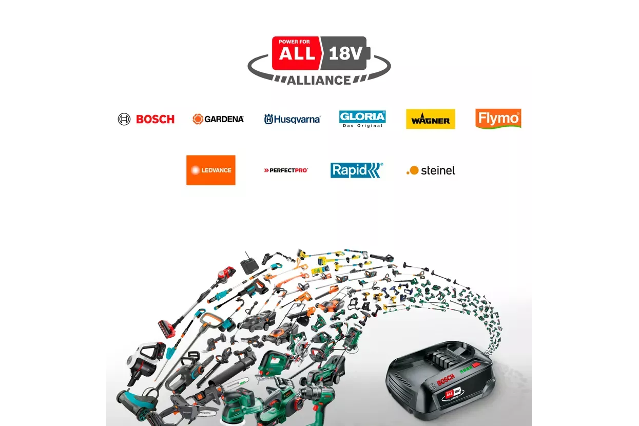 Akumulatorski sistem 18V POWER FOR ALL ALLIANCE  je popolna rešitev za hišna in vrtna opravila. Eno akumulatorsko baterijo je mogoče uporabljati za več orodij različnih znamk.