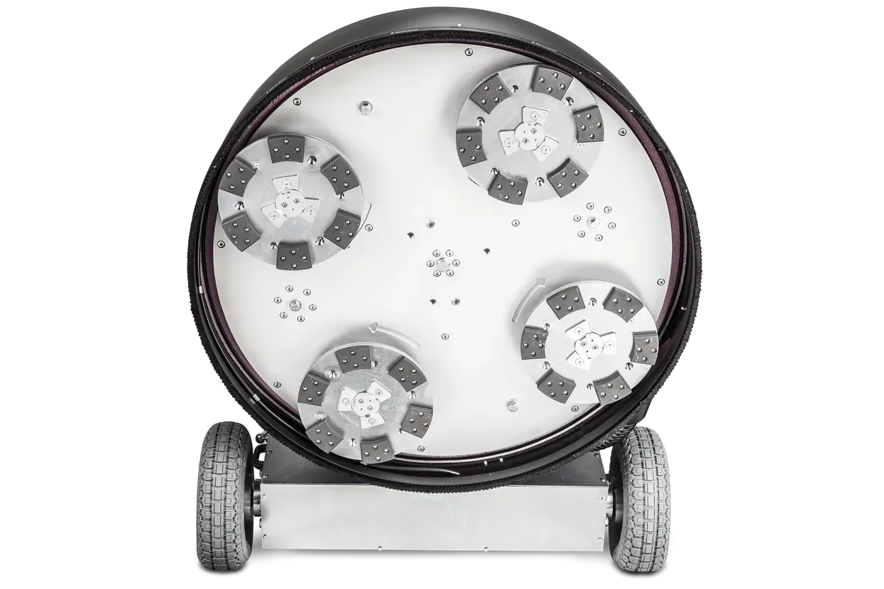 HTC 950 RX s štirimi brusilnimi diski premera 270 mm zagotavlja optimalno pokritost in enakomerno obdelavo površine. Z močjo 15 kW in napajanjem 380-415 V se spopada tudi z najzahtevnejšimi projekti brušenja. Stroj tehta 600 kg, dodatni sistem uteži pa omogoča prilagajanje pritiska glede na specifične zahteve projekta.
