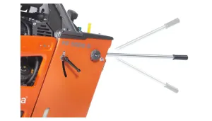Za večjo varnost pri delu je rezalnik opremljen s sklopko rezila, ki omogoča zaustavitev rezila med delovanjem motorja, kar je koristno za varen transport med tovornjakom in deloviščem. Poleg tega je vgrajen sistem za hitro izključevanje pri udarcu rezila, ki preprečuje poškodbe v primeru, ko se rezilo stisne v zarezo reza zaradi toplotnega raztezanja betona.