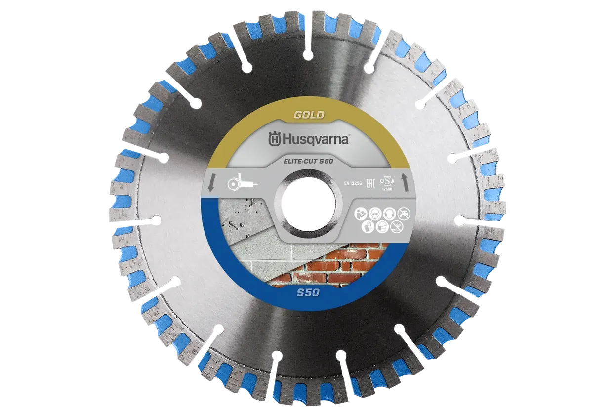 Husqvarna ELITE-CUT™ S50 je premium diamantna rezalna plošča, zasnovana za optimalno zmogljivost pri delu s kotnimi brusilkami. Združuje visoko hitrost rezanja z dolgo življenjsko dobo in odličnim razmerjem med ceno in kakovostjo, kar jo uvršča v zlato raven zmogljivosti med Husqvarninimi orodji.