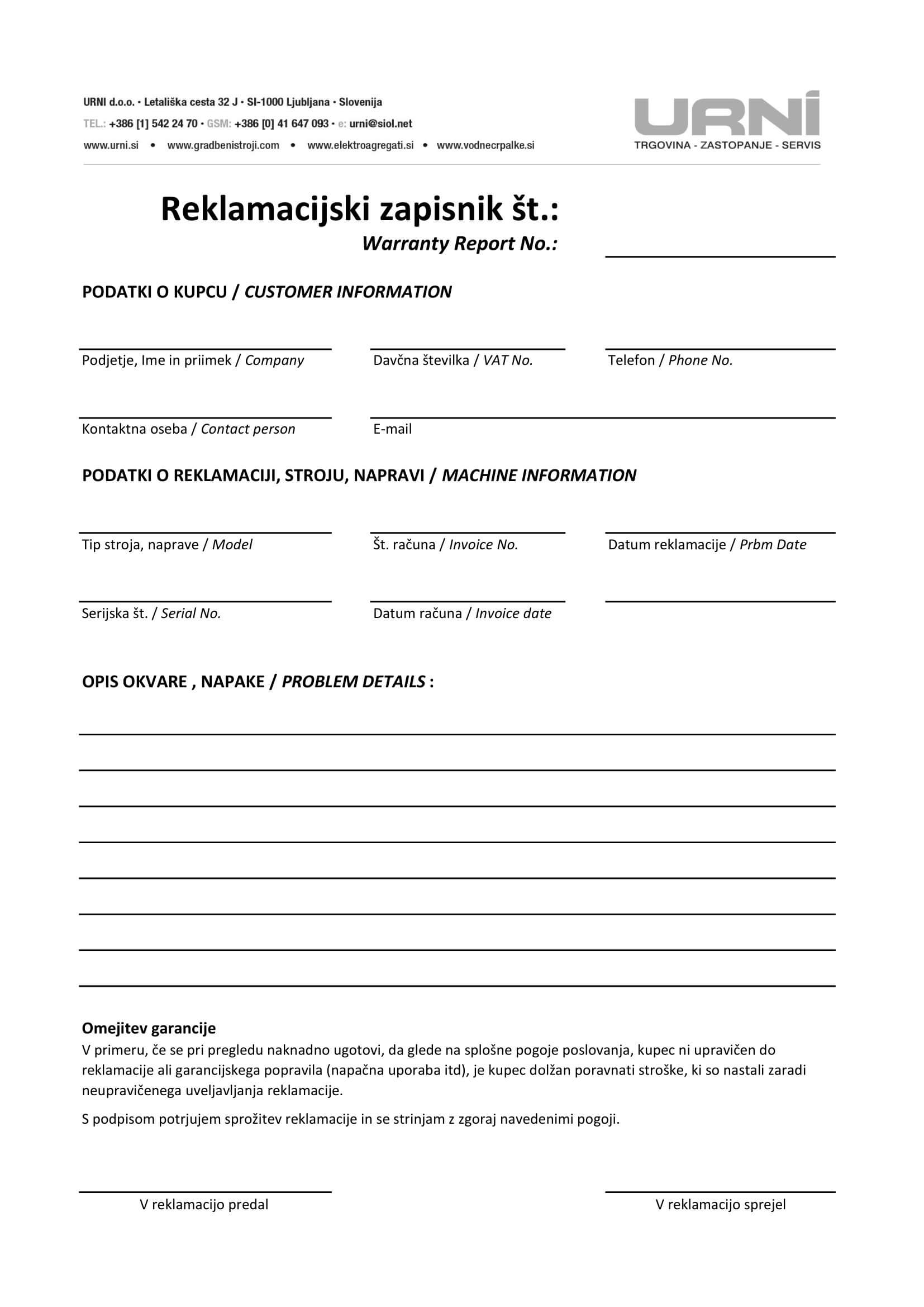 Vse garancijske zahtevke se izpolnjuje v angleščini in se jih posreduje na elektronski naslov klemen.selan@urni.si. Sodelavec vam bo odgovoril v najkrajšem možnem času in vas obvestil o nadaljnjem poteku postopka.