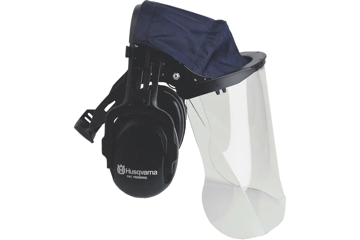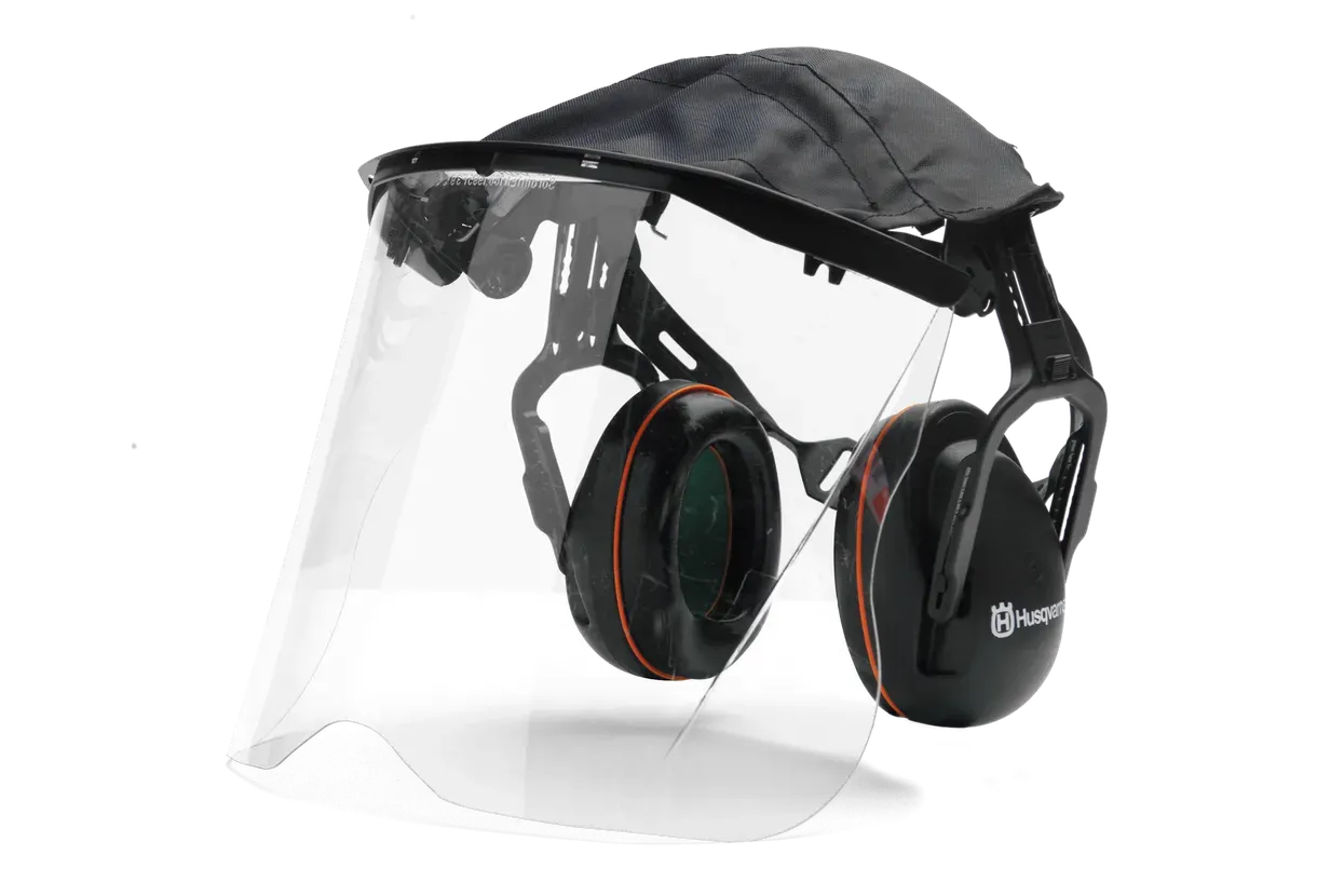 Vizir iz pleksi stekla z naglavnim trakom Zaščitniki sluha z nastavitvijo pritiska. NRR 25 dB(A). Opomba: Zaščitno plast folije za pleksi steklo je treba odstraniti z obeh strani pleksi stekla.