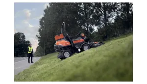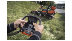 Through the included remote-control unit, the XR-model can manage mowing on difficult and sloped areas where seated operation is excluded. Switching the machine's driving characteristics from operator seated mode to remote mode is done within 30 seconds. For safety reasons, the machine can only be operated remotely when the operator’s seat is vacant and the remote-control is connected to the machine.