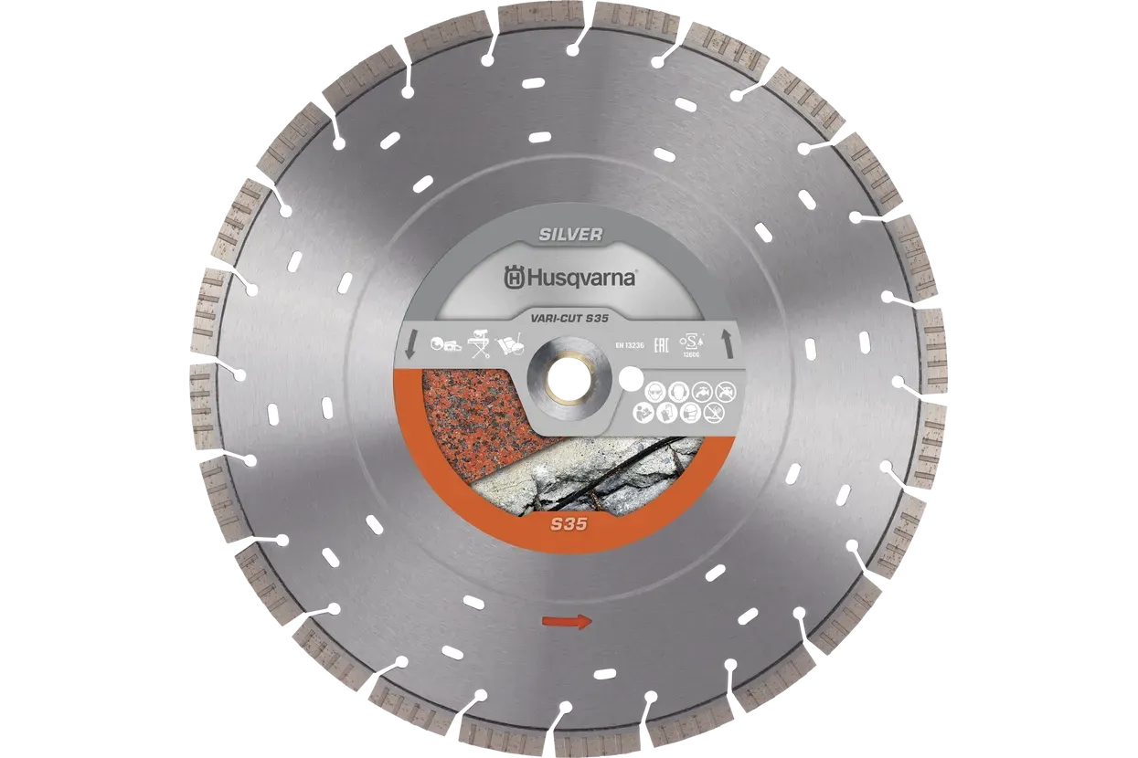 Husqvarna VARI-CUT™ S35 je profesionalna diamantna rezalna plošča, posebej zasnovana za učinkovito rezanje najtrših materialov, kot so granit, trdo armirani beton in tlakovec. Na voljo v treh različnih premerih (300 mm, 350 mm in 400 mm), ta rezalna plošča ponuja izjemno zmogljivost in vzdržljivost za zahtevna gradbena dela.