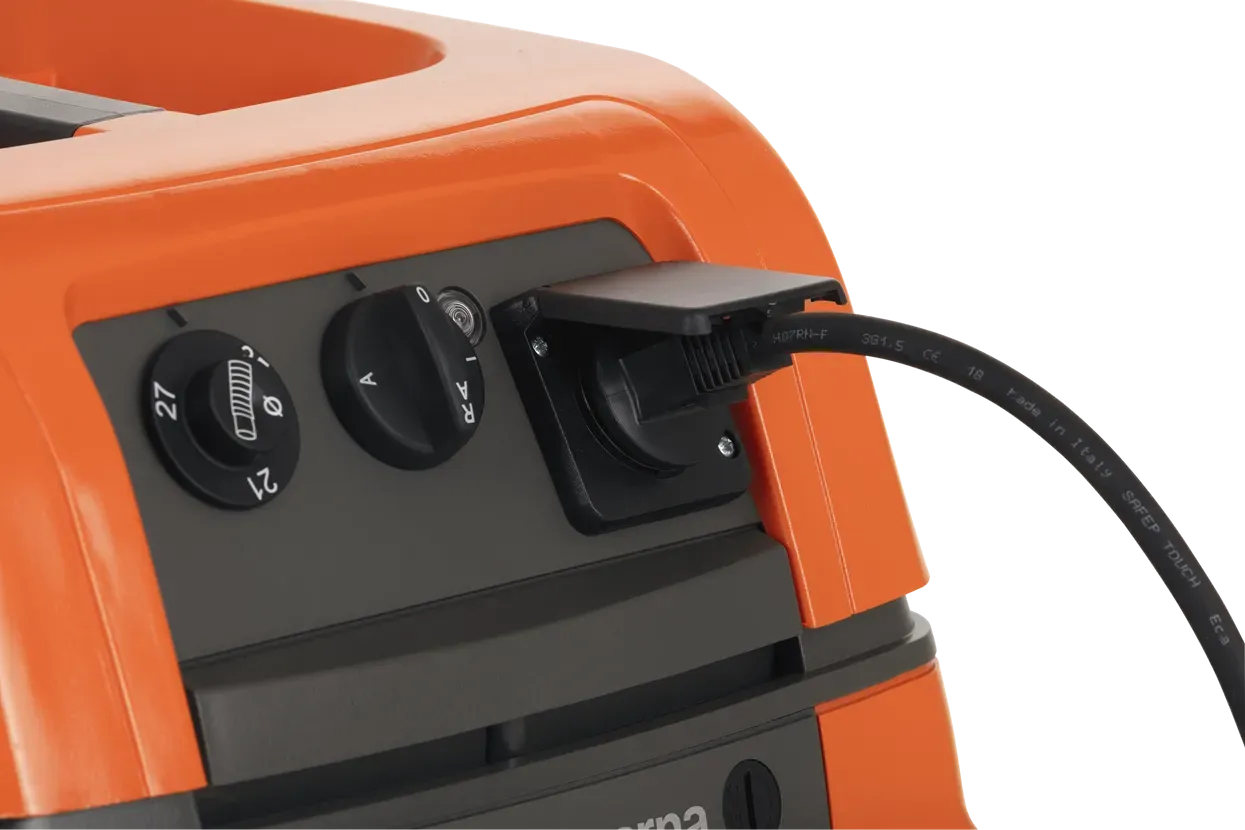 - Priključitev električnega orodja - Opremljen je s pomožno električno vtičnico za hitro in enostavno povezavo z ročnim električnim orodjem, kar omogoča takojšnje odsesavanje prahu med delom.