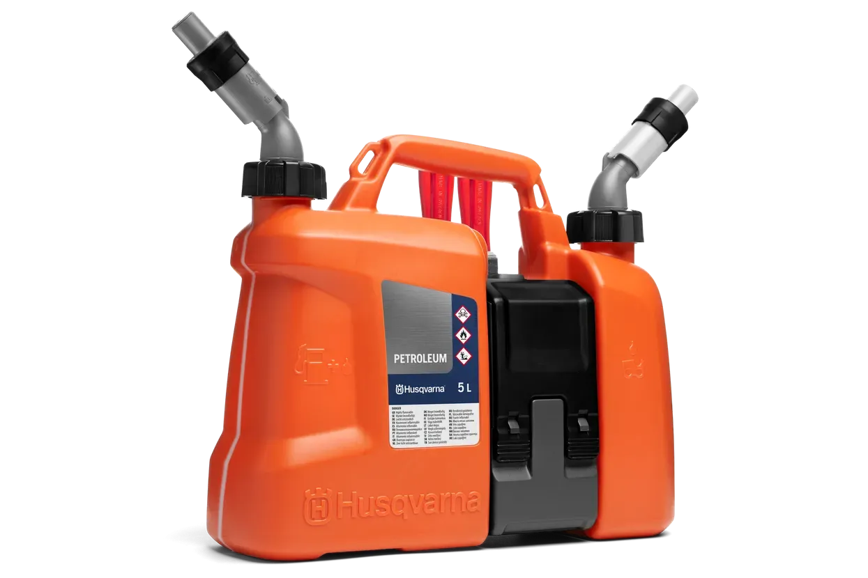 Naša nova kombinirana posoda omogoča polnjenje bencina brez polivanja goriva in tako nimate nobenih izgub. Dodatna sta bili optimirani prostornini posod na ustrzno razmerje goriva in verižnega olja (5.0 / 2.5 l). Prav tako ima kombinirana posoda integriran predalček za pogosto rabljeno orodje in nadomestne dele. Odobreno v skladu s predpisi ES.