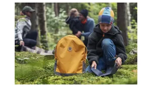 Practical backpack within the Husqvarna Xplorer Kids Collection. With sustainability in mind, the backpack is made from certified recycled polyester made from re-used PET bottles. Padded shoulder pads and back as well as a detachable seat pad make the backpack comfortable to use. Smart details as tablet compartment and easy-to-reach bottle pockets...