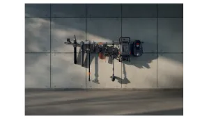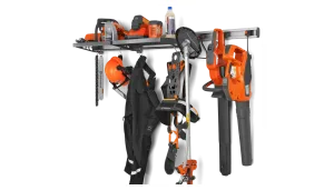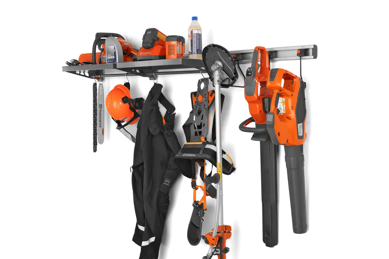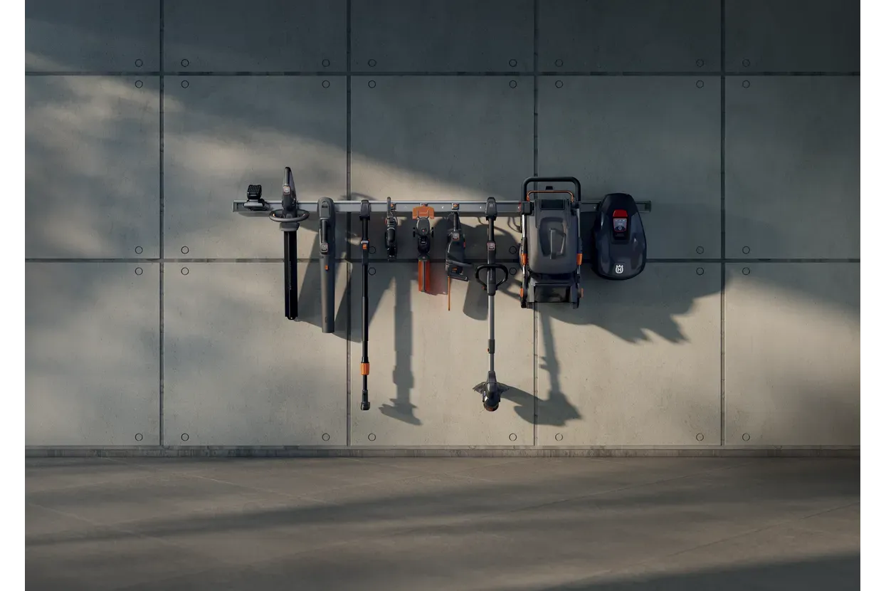 Vsak izdelek Aspire je opremljen s prilagojenim kavljem, ki se prilega temu stenskemu nosilcu. Združljiv je tudi s kompletom kljuk za shranjevanje Husqvarna Aspire za vse vaše vrtnarsko orodje, kot so ročno orodje, vodna cev ali metla. Priloženi so vijaki, plastični čepi in končni pokrovčki, s katerimi lahko pritrdite ogrodje s čistim zaključenim videzom.